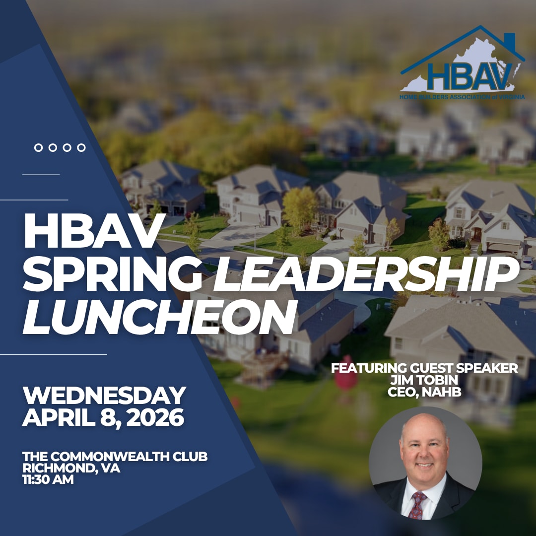 Please join us for a member-wide luncheon on Wednesday, April 8 featuring guest speaker, Jim Tobin, CEO of the National Association of Home Builders (NAHB). Please see below for the full meeting schedule. Space is limited and registration is required. Questions? Contact Emily Evola at emily@hbav.com. Thanks!