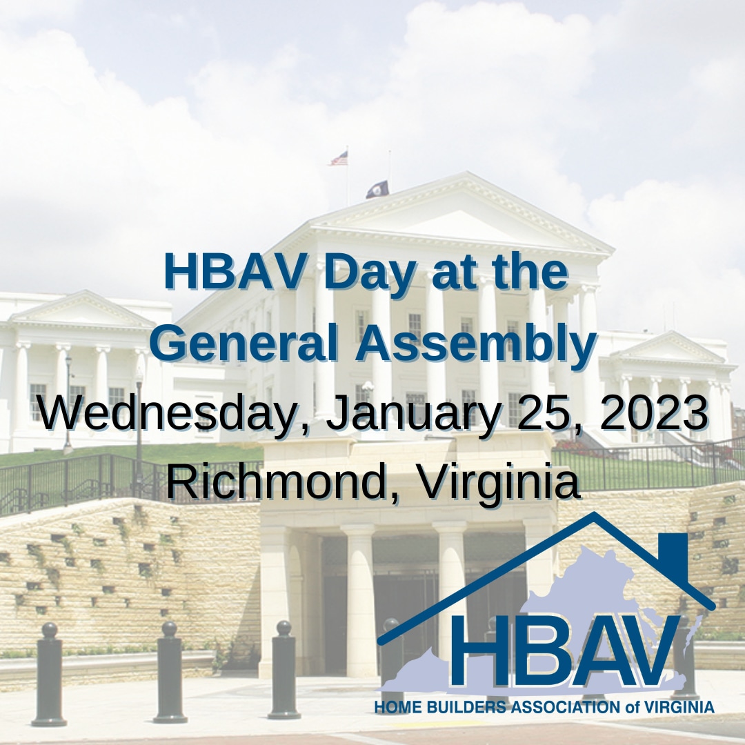 Join us for a day at the Virginia General Assembly! Please coordinate with you local HBA to schedule meetings with members of the General Assembly between 7:30 and 11:00 am. After meetings at the General Assembly, HBAV will host all members and guests in our offices located at the James Center in Richmond, VA for lunch and a debrief meeting. Questions? Contact Emily Evola at emily@hbav.com.