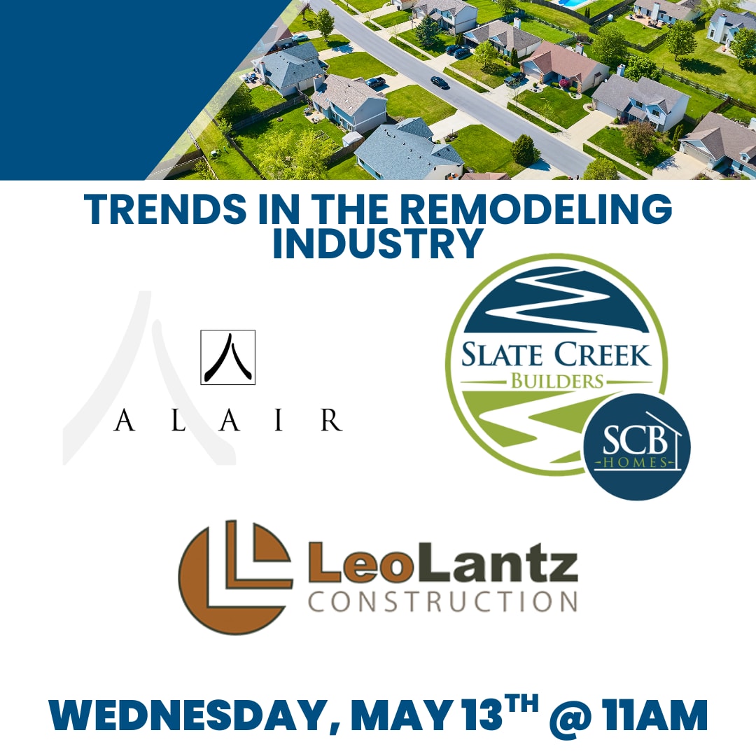 May is National Home Remodeling Month! Please join us on Wednesday, May 13th at 11 AM EST for a panel discussion on trends in the remodeling industry. Attendees will hear from Alair Homes Arlington, Leo Lantz Construction, & Slate Creek Builders! If you have trouble registering, please contact Channing Pitts at channing@hbav.com.