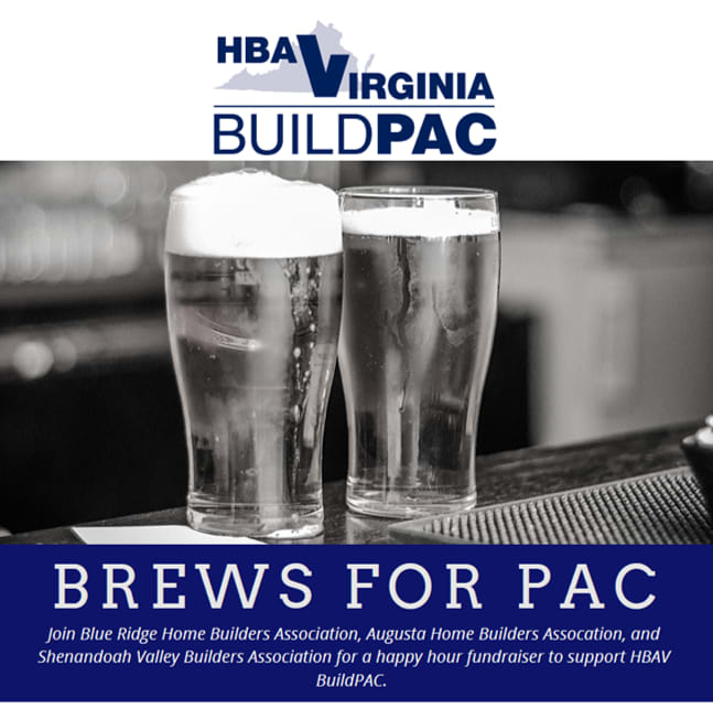 Brews for PAC is a happy hour fundraiser for HBAV Build PAC, supported by the Blue Ridge Home Builders Association, the Augusta Home Builders Association, and Shenandoah Valley Home Builders Association. Support of this event will assist in: •Supporting Pro-Housing Candidates to the Virginia General Assembly through: Education, Advocacy, and Action! •Having your voices heard! •Shaping the Future of Virginia’s Housing Industry