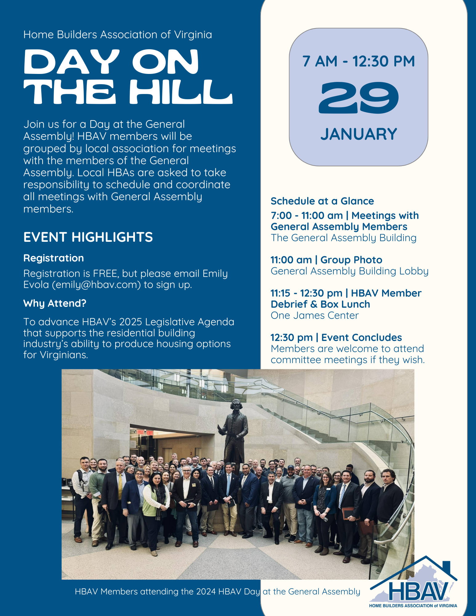 Join us for a day at the Virginia General Assembly! Please coordinate with you local HBA to schedule meetings with members of the General Assembly between 7:30 and 11:00 am. After meetings at the General Assembly, HBAV will host all members and guests in for lunch and a debrief meeting in the General Assembly Building. Questions? Contact Emily Evola at emily@hbav.com.