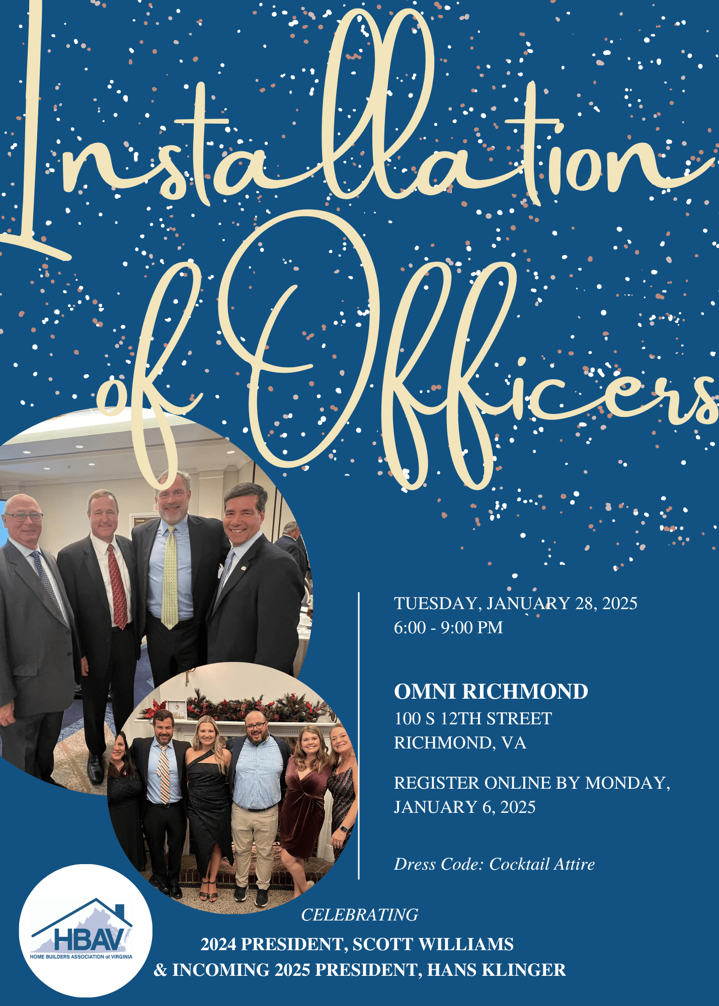 Each year, the HBAV elected officers and directors for the upcoming year are officially installed at this event. The ceremony includes the oath of office for all officers, as well all elected directors accepting their association duties and responsibilities. We will also recognize our 2024 HBAV Keystone Club members for their commitment to the housing industry and the association. This year, we are pleased to celebrate our outgoing 2024 President, Scott Williams, and welcome our 2025 President, Hans Klinger of HHHunt Homes.